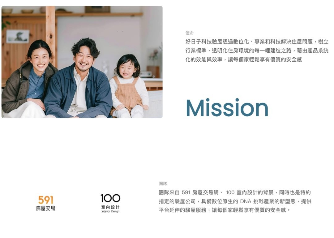 好日子科技驗屋之所以能在眾多品牌中脫穎而出,源自我們在驗屋服務中的創新和專業。傳統驗屋多偏重表面檢查,而我們的服務不僅注重檢測的全面性,更在流程和技術上不斷突破。我們導入了科學的檢測工具和標準化的流程,確保每一個檢測細節精準且可靠。除此之外,我們強化每一位屋主的良好服務體驗,夠過數位化的創新,將原本繁瑣的產業流程透過獨家研發的 APP 系統,提供了透明的報告和即時回饋,讓消費者能夠更清楚了解房屋狀況,並提前做出必要的修繕決策。這樣的專業服務,不僅降低了屋主對於房屋隱患的擔憂,也降低了房屋交易的糾紛。透過數位化、專業和科技,樹立產業的新標準、透明化住房環境的每一哩建造之路,藉由獨家研發 APP 產品系統化的效能與效率,讓每個家輕鬆享有優質的安全感,這也是好日子科技驗屋的品牌使命!