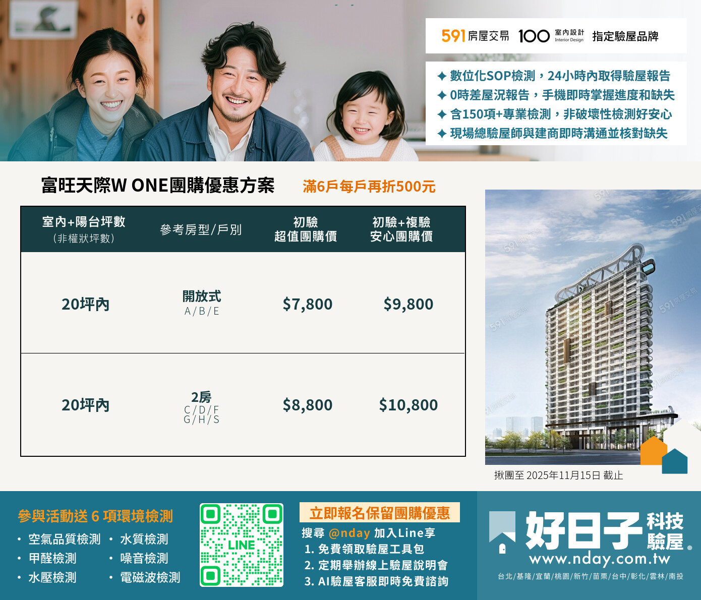 七天前免費取消,如需假日驗屋加價1500元/場