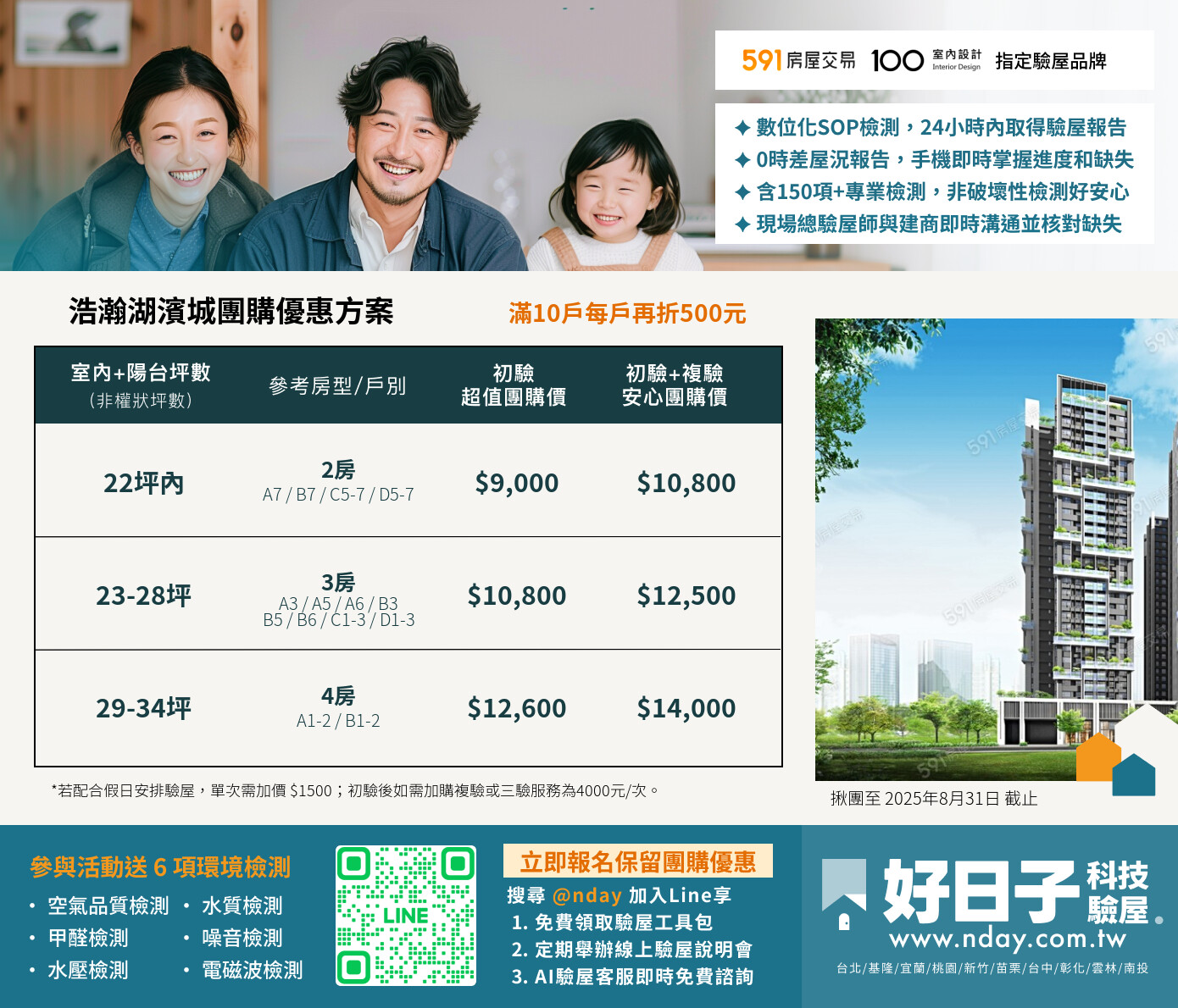 七天前免費取消,如需假日驗屋加價1500元/場