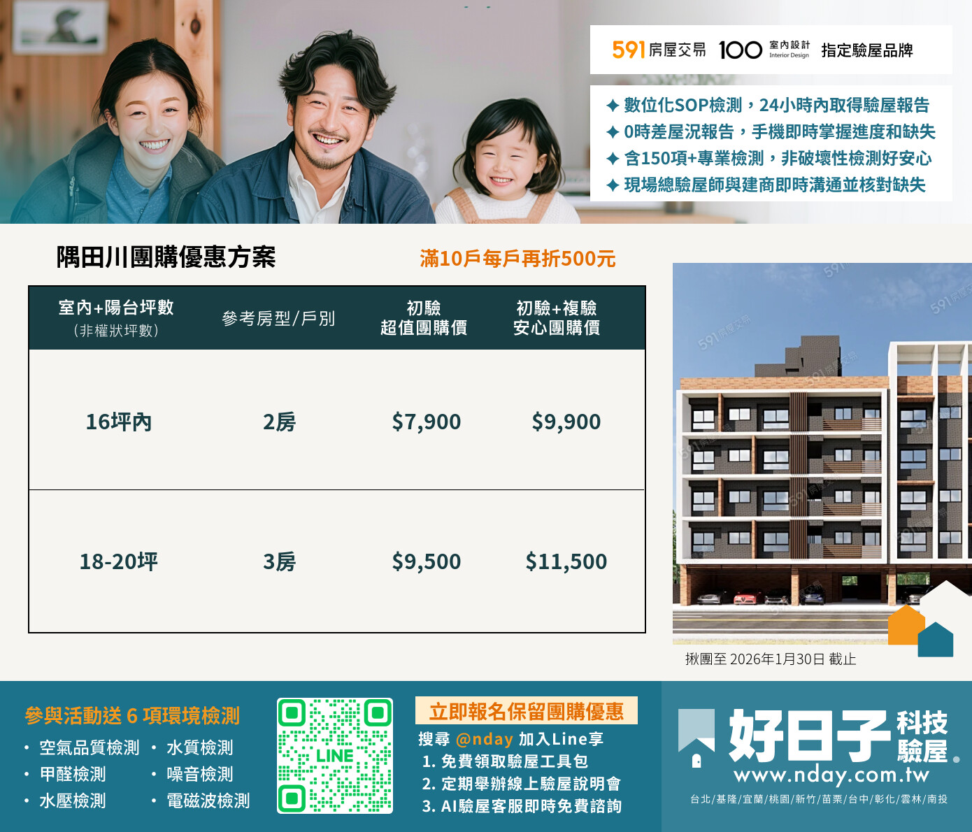 | 室內+陽台坪數 | 房型 | 初驗價格 | 初驗+複驗價格 |